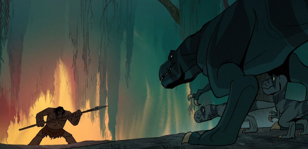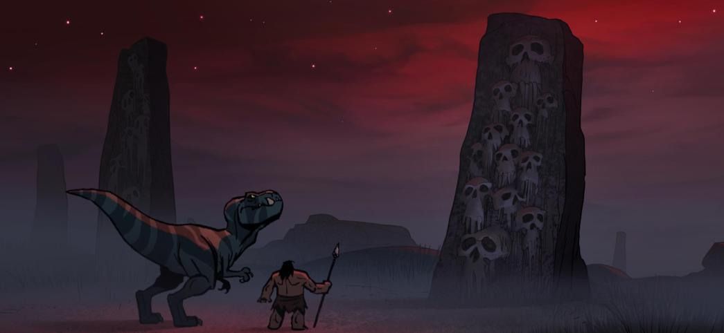 Придя к своей пещере, он с ужасом увидел, как несколько кровожадных динозавров убивают его возлюбленную и детей. Находясь в отчаянии и в одиночестве, протагонист решает объединить свои силы с тираннозавром, которые также пытается противостоять тем злобным динозавром, стараясь защитить от них своих детенышей.
